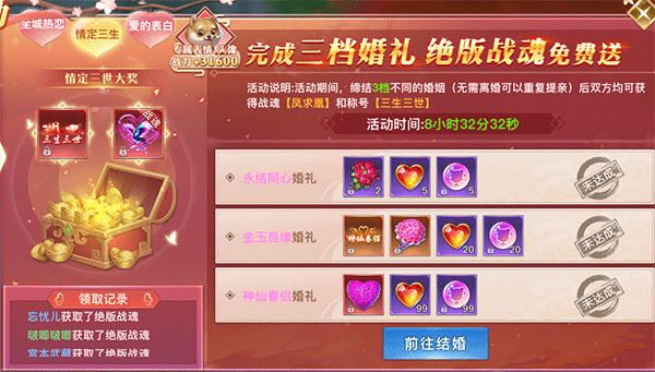 一、 情定三生,完成三档婚礼,绝版战魂免费送!