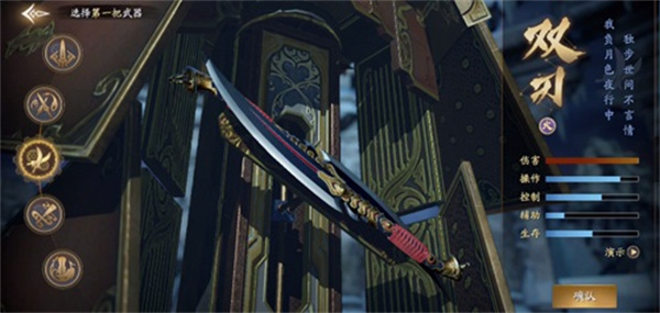 其中双刃的伤害是所有武器中最高的,棍为生存能力最强的武器。