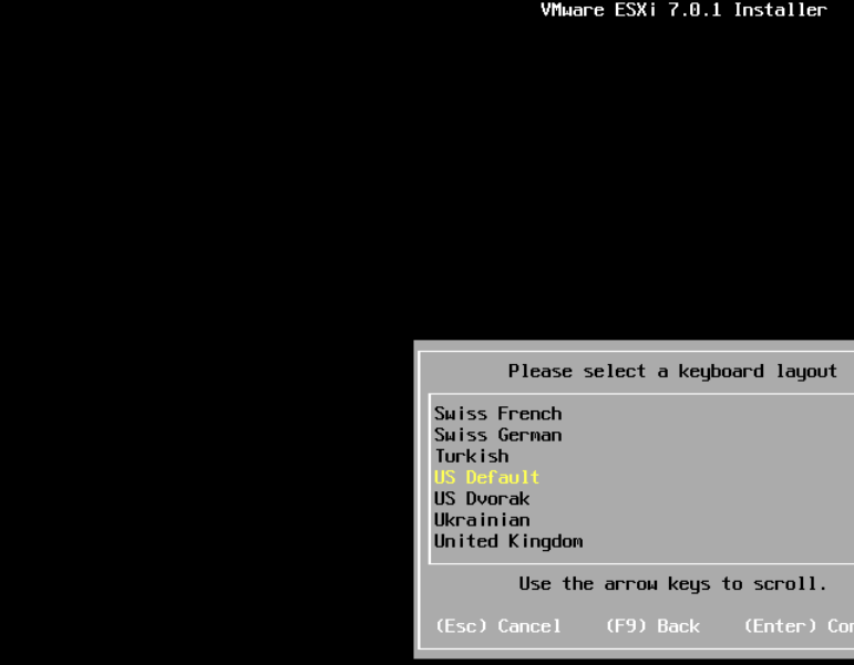 8、提示选择键盘类型,选择"US Default",默认美国标准,按【Enter】键继续。