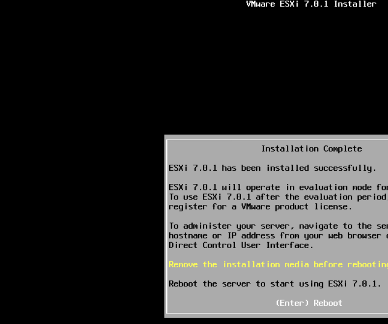 12、安装的时间取决于服务器的性能,等待一段时间后即可完成VMware ESXi 7.0.1的安装,按【Enter】键重启服务器。