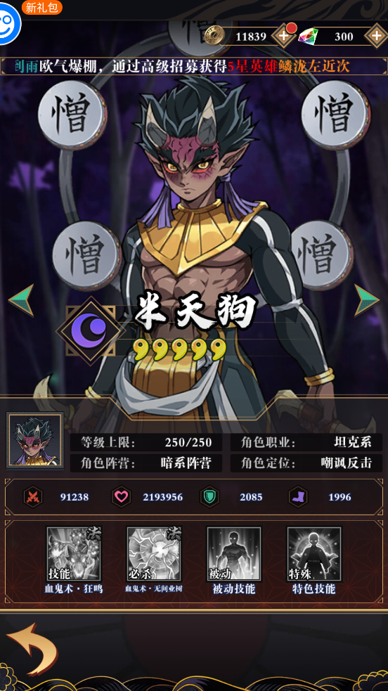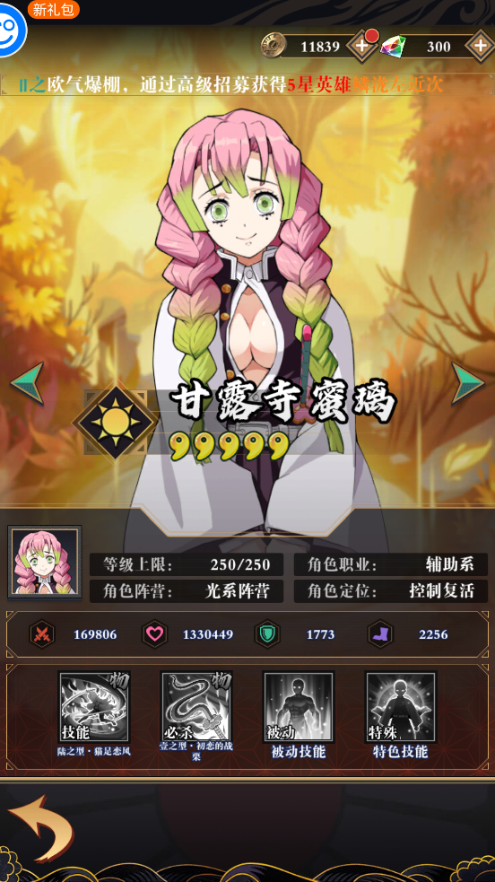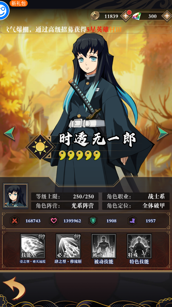 2、进阶输出阵容:妓夫太郎(爆发) + 炎柱(前排) + 蝴蝶忍(毒伤辅助)