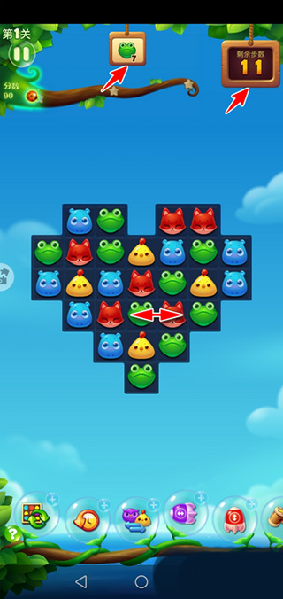 滑动手指让三个及以上的同色小动物横竖相连即可消除,完成每关的指定消除目标即可过关!