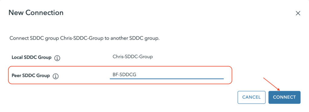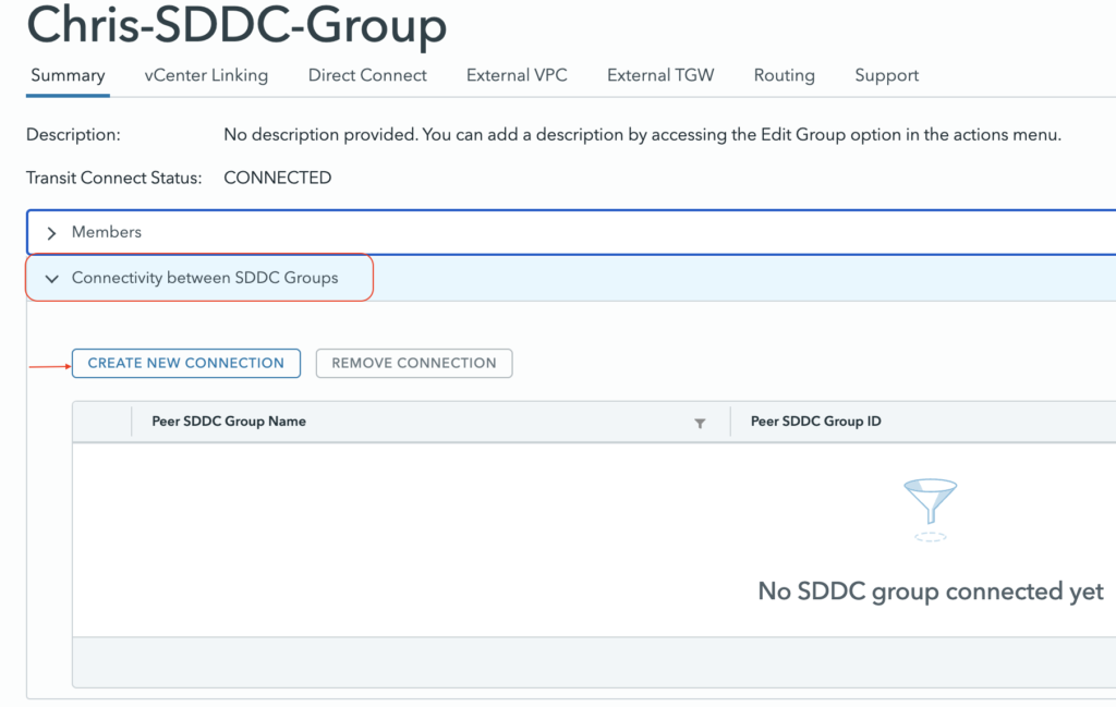 只需选择一个已部署至少一个 SDDC 的 SDDC 组,系统便会自动实现组间互联;