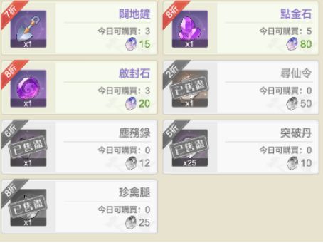 (5)幻灵之地商店只购买突破丹,如果遇到T0弟子,可酌情购买,不过不是很建议,另外不要购买4000的橙色神通,因为后续玩法组队副本可以刷出来,所以就不要浪费了,稀有材料的话,可以根据自身需求购买,如果绑玉不多的话就可以选择放弃。