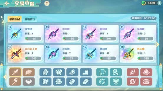 (3)NPC购买的装备品阶是根据灵器货架的等级挂钩的,如8阶枪,如果锐武阁没有达到8阶,那么想要把8阶枪卖掉就需要推销,花费民心就能够将灵器货架等级未到的高阶装备出售了。长按推销可以更换推销装备。