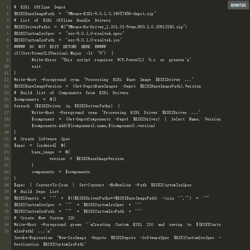 如需创建包含Realtek网络驱动的自定义ESX安装ISO镜像,需先下载所需的ESX离线仓库(zip 格式),然后使用以下PowerCLI脚本(无需依赖现有基础设施,如vCenter、ESX等):如需创建包含Realtek网络驱动的自定义ESX安装ISO镜像,需先下载所需的ESX离线仓库(zip格式),然后使用以下PowerCLI脚本(无需依赖现有基础设施,如vCenter、ESX等):