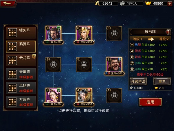 武将进阶、修炼终成大器,同时麾下士兵也可提升进阶,护主保国!多余武将无法上阵,只要有缘分即可加为旗下副将,同为主公陷阵杀敌。