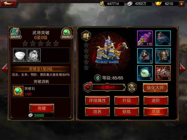这次为大家介绍的就是武将培养的最后一个方式——武将突破,当武将等级达到50级的时候,武将突破功能就会开启。每一次武将突破都将带来武将属性的巨大提升,大家只需要点击武将面板里的突破,就可以打开武将突破界面了。武将的突破主要需要银两,突破石与突破的道具,突破至一定等级,再进行武将突破还需消耗同名武将卡。突破的道具可以通过精英副本收集而得,也可以进入突破商店进行购买。