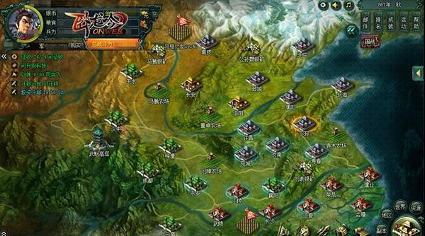 在主城界面右下角的主城按钮边上点击“世界”,则可以浏览游戏中世界的全貌了。卧龙吟中的世界地图上共有二十多座城池,不过城池都按照等级划分的,玩家最初在洛阳战胜张角之后,就可以搬迁到长安,打败董卓可以升到二十级,然后就可以选择加入哪个国家了。