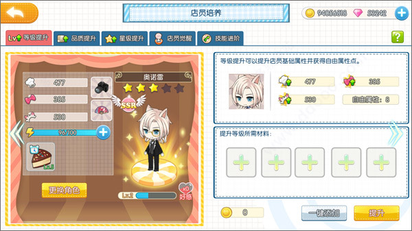 等级提升:提升等级可以用经验书也可以吃其他店员来升级(好残酷的喵星人世界)……可以手动挑选材料也可以交给系统君一键添加。这里要说一下,只有珍贵度在R以下的路人店员也就是N级店员会被一键添加,所以店长们不用担心自己心水的小哥哥会遭遇被吃掉的命运了。(什么?你说喜欢N级的?!emmm……)