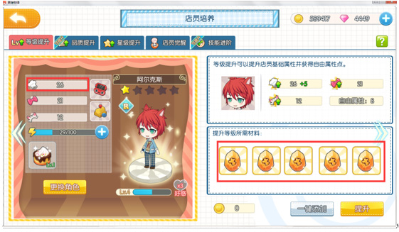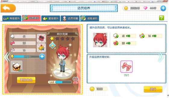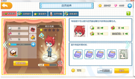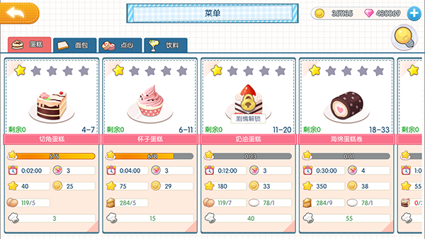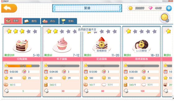 甜品,通过升级、任务等解锁新品,同时料理最高可以提升到5星级,升星会增加各种属性;制作甜品需要消耗相应食材及店员体力值,研发升级需要消耗体力值。