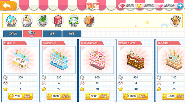 玩家还可以随意布置甜品店、休息室,可选种类有操作台、橱柜、桌、椅、墙纸、地板、装饰及其他功能性家具,共十余种类别,数百种家具。