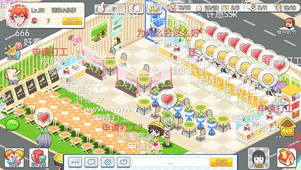 苦心经营的甜品店日益壮大,若干猫美男陪伴在身边,当然想与朋友一同分享喜(xuan)悦(yao)之(yi)情(xia)。游戏中可以与好友亲密互动,拜访好友,随心所欲的为他点赞、送花、发送弹幕留言,还可以与他PK一决高下。当然,友谊第一,或许借用店员,帮助好友完成订单才是最好的选择。