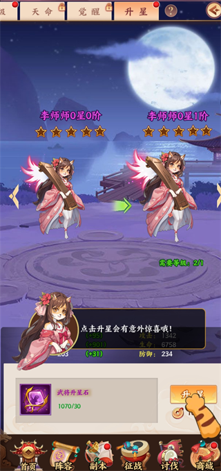 2、而武将可以通过收集升星资源来提升自身的品质,拉高武将的上限。