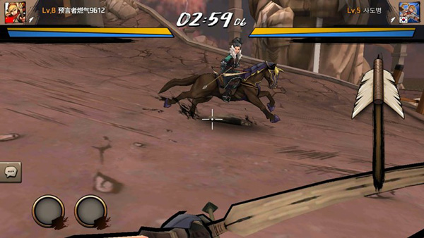 在马背上展示弯弓射箭的英姿,是每个拥有英雄梦的少年心之所向。《战箭天下》应用了陀螺仪感应器的操作方法,将游戏设备倾斜,移动准心来锁定目标。同时,设定了符合骑马战斗的各部位伤害值,即根据目标人物和马的各部位设定的伤害值都各不相同。