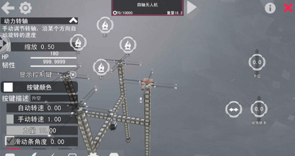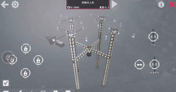 安装完成后,最重要的一步就来了,我们要通过点机械名称旁的按钮来使机械进入模拟场中,测试它的运动状态。将旁边的飞行按钮上拉,即可测试飞行状态。然后根据出现的问题,调整不同零件的参数。有的人飞行器会飞不起来,有的人飞行器会偏离直飞的轨道,还有像小编一样一着陆就散架了的.......遇到这些情况不要担心,合理排查出现问题的位置,调整当前螺旋桨扇叶参数,或者检查机械连接是否牢固,即可轻松解决。