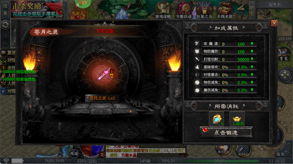 锻造装备,提升攻魔道、物防魔防等属性,消耗材料与元宝即可强化战力。