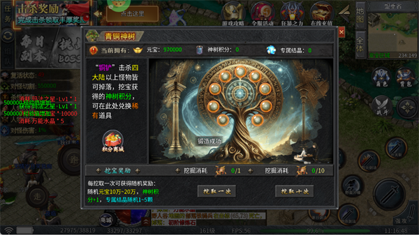 参与挖宝获取神树积分与专属结晶,可兑换极品道具、时装,挖宝还能获得随机元宝奖励。