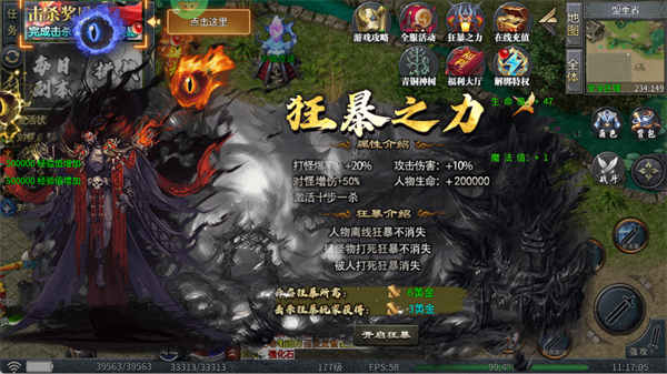 开启后可提升打怪爆率、对怪增伤等属性,人物离线或被怪物打死时狂暴状态不消失,被人打死则消失,消耗黄金可开启。