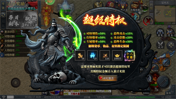 花费58元激活后,可获得对怪增伤、打怪爆率等多项属性加成,还能解锁货币、物品解绑限制,助力快速成长。