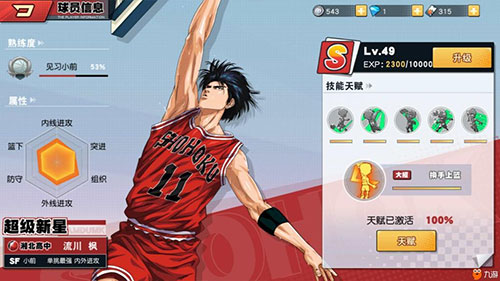 我们再结合三井寿的属性成长,内线C,进攻B,身体D,外线S,防守A,技巧A。我们可以看出三井寿的身体技能非常的差,但是大招MVP回溯的技能可以完美弥补这个缺点。且他的外线能力是恐怖的S,试问有几个球员有着S级的属性能力?