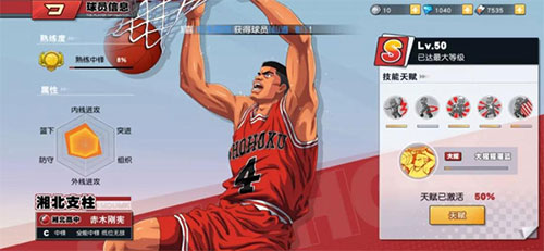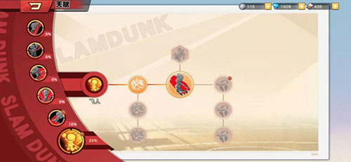 不同玩家的操作习惯不同,选择解锁天赋的顺序也会有很大不同。拿樱木花道来说,技能为:飞人(大招)、飞身篮板、庶民上篮、超级加速、哼哼防守和扑球。