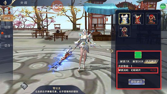 玩家通过商城购买解锁所需材料进行解锁,解锁为7天、30天、永久解锁,所用道具数量不同如下: