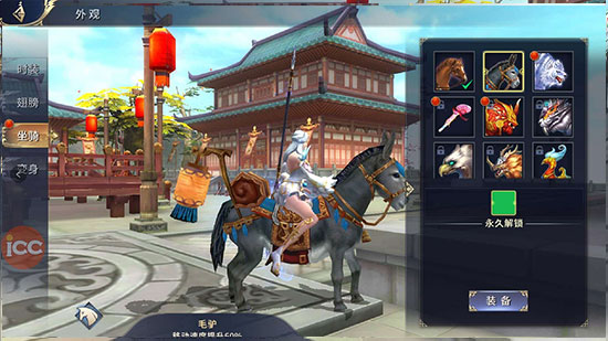 游戏中共有9种坐骑分别为:黄棕马、毛驴、白虎、棒棒糖、穷奇、火焰虎、狮鸳、四不像、凤凰。所有坐骑不分男女角色、等级达到10级均可选择。