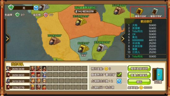 4、抢矿场中的资源矿分为铜矿、银矿、金矿三种。每天可以免费进攻4次(耗尽后每消费50红钻可以购买1次),每次只能占领一个矿,每次最多占领2小时。