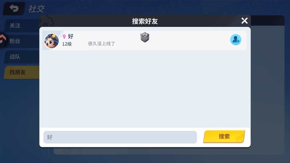 3、此外,还能点击 “搜索好友” 选项,在弹出页面的输入框中输入玩家名称,点击 “搜索” 按钮,然后在上方显示的玩家信息右侧点击 “加号” 按钮,就能添加对方为好友了。