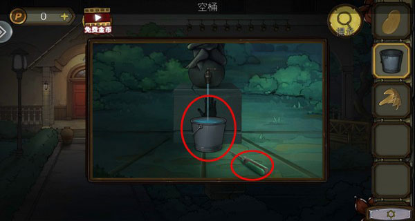 天使雕像拿到螺丝刀,铁桶接水,水倒进树洞里,拿到蘑菇铜卡。