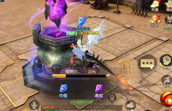任务介绍:盗取神鼎需要小伙伴深入敌国神鼎处盗取敌方铭文,在中午的12点-14点会有国探时间,盗取神鼎会有额外的经验加成,这里是各位小伙伴第一次与敌军相遇,所以建议小伙伴们集结国家兄弟,一起前往敌方神鼎处一起任务盗取,盗取高级紫色则获得经验最多,若敌方身上有紫鼎,击败敌方玩家,也能获得对方身上的紫色神鼎哦~ 获得后赶紧回城交任务~以免被人抢去~