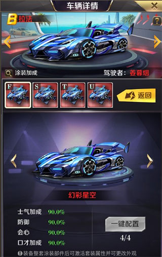 每台座驾一共有4个涂装部位可以装备,根据包括有紫橙红三种品质,每个品质的涂装都会提供口才,士气,会心,防御四种基础属性的其中三种加成,品质越高加成的属性越高。