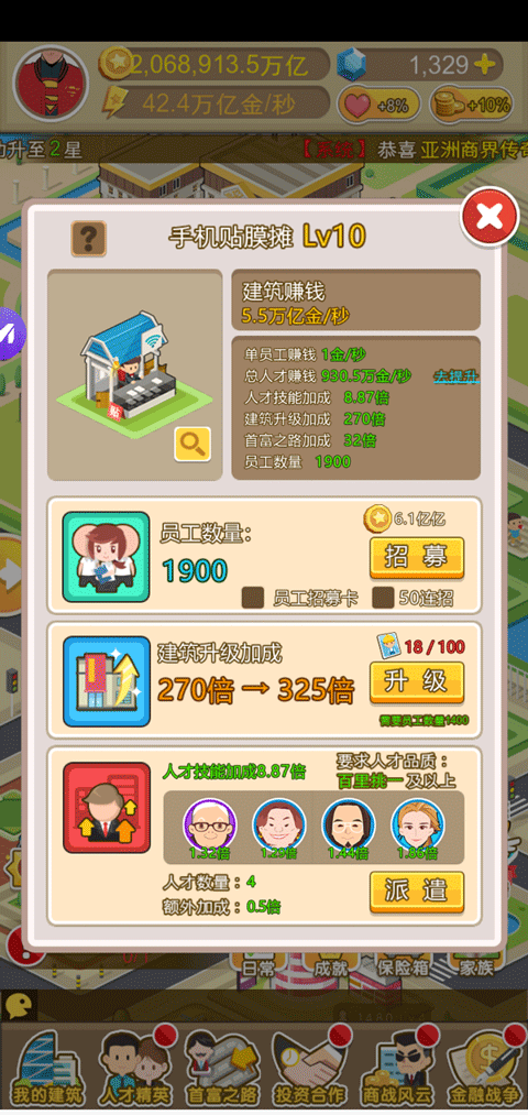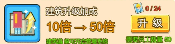招募员工是快速提升赚钱速度方式之一,只需要花费金币就可以提升赚钱速度,当然花费的金币数量也是逐渐递增的。升级建筑等级则能提供吸引人的倍数加成,升级需要的建筑卡可以通过商战兑换或商店购买获得。