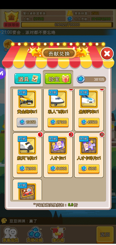 家族:选择一个优秀的家族也是非常重要的家族里边有族战可以涨贡献,贡献达到一定的数量后可以换取六星座驾,人才卡之类的功能道具。
