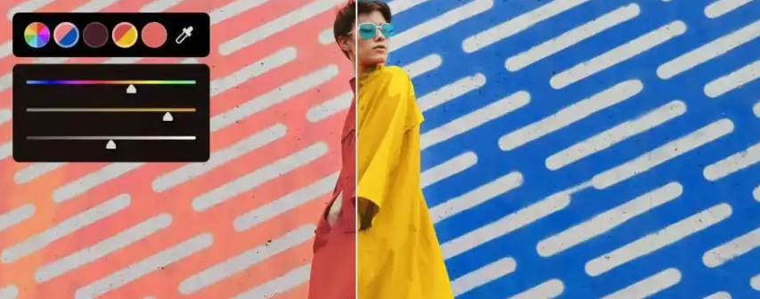 通过上下文工具栏启动该功能后,画布上会显示直观的色彩控制点,用户可以实时调整特定颜色的色相、饱和度与明度参数。系统会自动识别画面中的六个主色,也支持使用取色器自定义色彩选取范围。