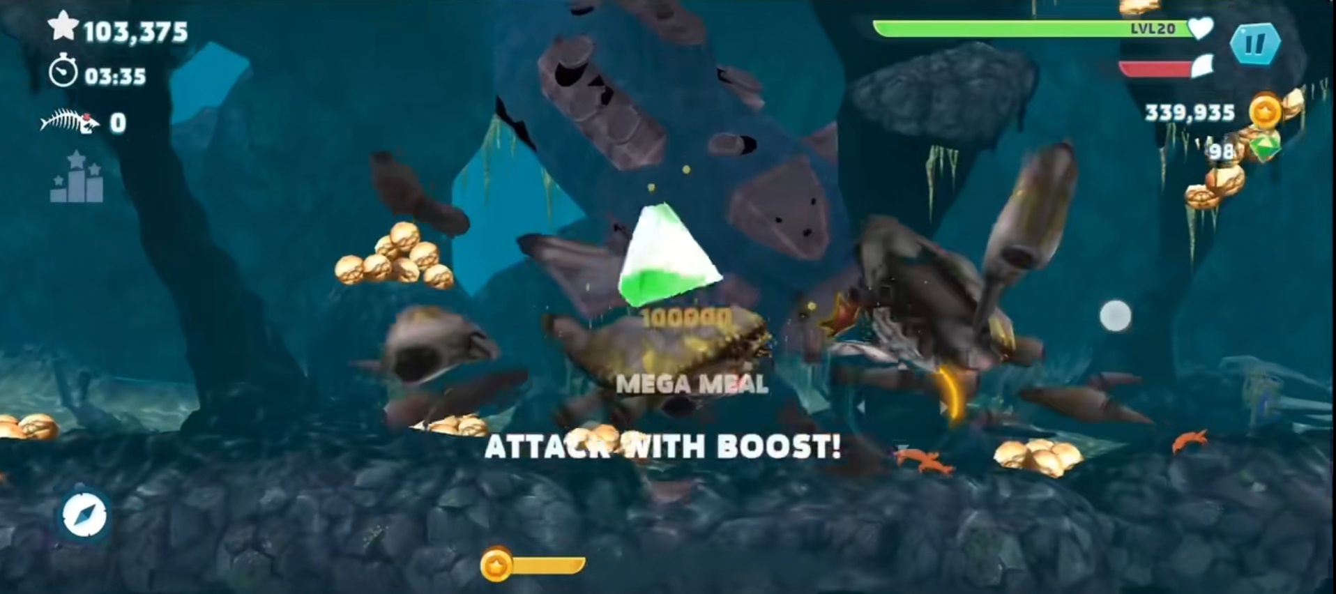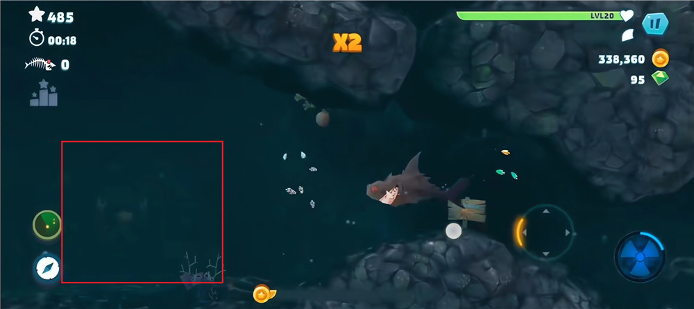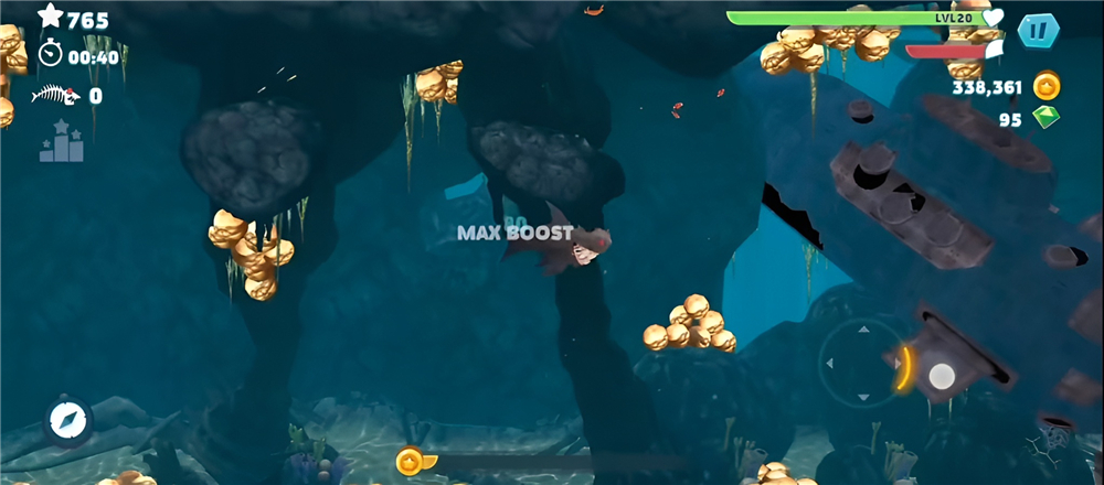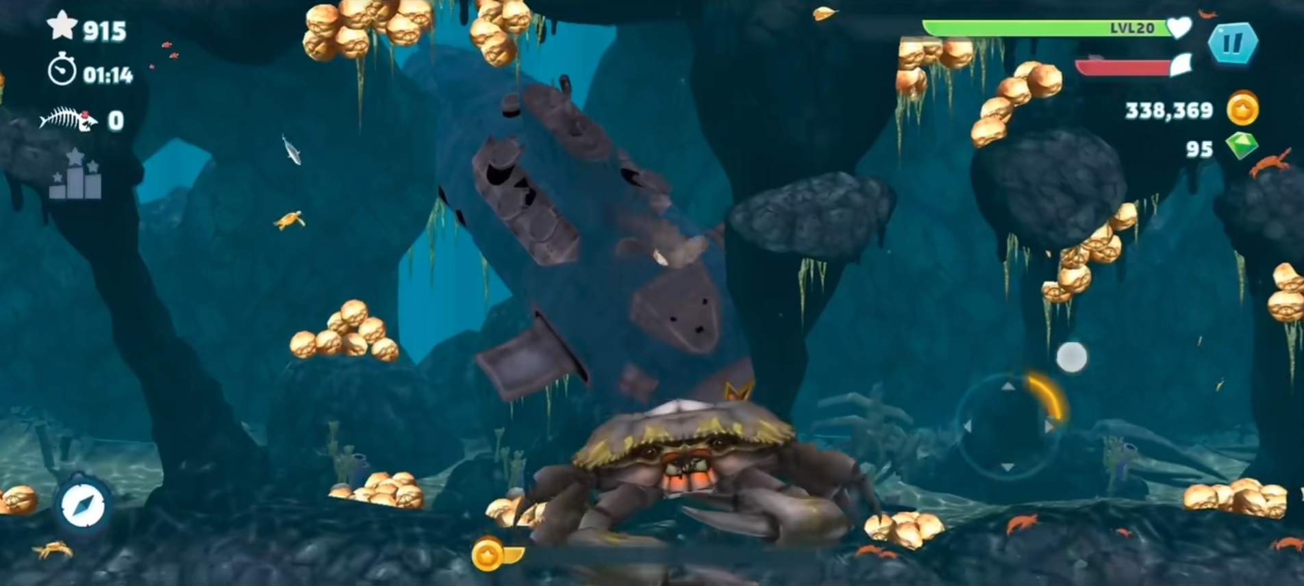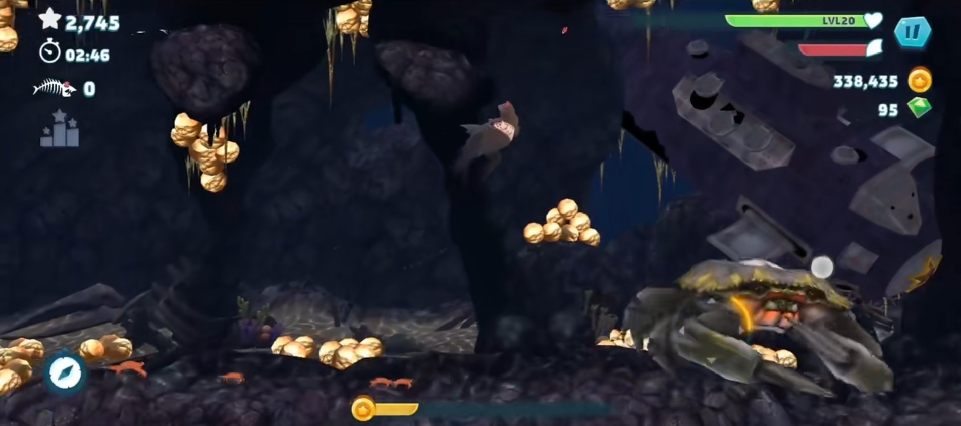 所以就是要可着劲的攒金币,攒金币之后再升级鲨鱼的咬合力、加速度,最开始升级一次咬合力是1200金币,其他的依次类推,但是每玩一次最多金币的时候就200来个,不是我能力不行,其实咋说呢等级不够,各方面不行,随时提防着危险,所以也很难攒到多少金币。