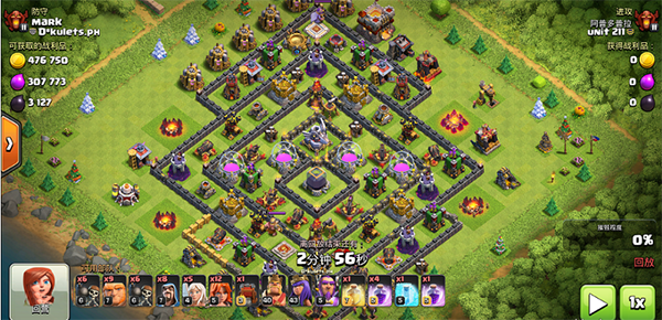 (2)玩家搜索到自己喜欢的对手后,需要在限定的3分钟内,将对手村庄内的主要建筑摧毁掉,当摧毁度达到50%时,即可获得胜利。胜利的玩家从对手的村庄里,掠夺到一些金币、圣水、暗黑重油等奖励。同时,玩家可获得相应的奖杯,奖杯越高胜利获得的奖励越多。如果玩家未能在规定时间内,达到50%摧毁度,则进攻失败,同时会扣除一些奖杯。玩家在联机模式下,将会耗损一些兵种或药水。