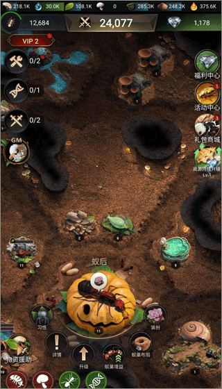 1、蚁巢地区限制条件:想要探索除去自己等级之外的更多蚁巢位置,就必须将蚁后的等级提升,而蚁后想要提升等级,就转化成了各种资源的获取以及仓库储存限制。这两个条件是相互转换的,说白了,想解锁更多的区域,你就得有这么多的物资。而新手引导结束之后,玩家们的主要目标也应该变成想法提高蚁后的等级,这样主要任务就转化成为尽可能多的在游戏中获取肉,水,植物,沙子,蜜露等种种资源。