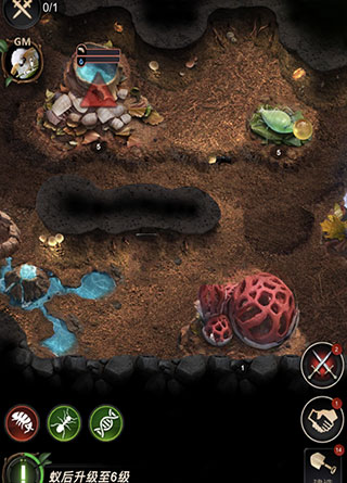 蚁巢地区限制条件:想要探索除去自己等级之外的更多蚁巢位置,就必须将蚁后的等级提升,而蚁后想要提升等级,就转化成了各种资源的获取以及仓库储存限制。这两个条件是相互转换的,说白了,想解锁更多的区域,你就得有这么多的物资。而新手引导结束之后,玩家们的主要目标也应该变成想法提高蚁后的等级,这样主要任务就转化成为尽可能多的在游戏中获取肉,水,植物,沙子,蜜露等种种资源。