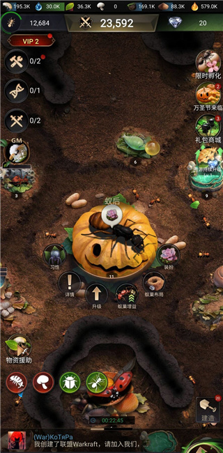 1.新增特化蚁异化系统(统领蚁后达到25级且已建造特化蚁变异池时解锁,可使用变异孢子、特级孢子和橙色特化蚁残壳进行升级);