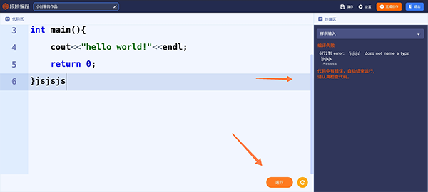 5、随后就可以进入代码程序自己编辑,编辑完成点击运行,如果编辑错误就会显示编译失败,显示哪一行弄错了自己修改就行了