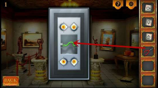 这个游戏非常需要努力思考,要多动脑子想一想怎么样才能逃出去,非常的难,当然,最简单的办法就是把屏幕上的每一个地方都点击了,第一关先做那个人的提示,然后各个地方有一个纸片,共有4个,然后再找碎片的地方有个钳子,播对正确的密码用钳子把线剪了。