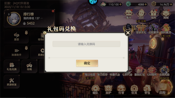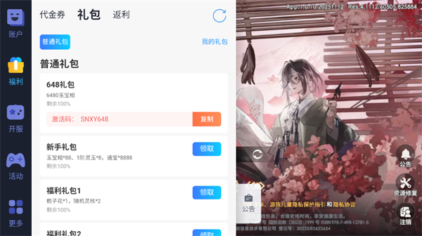 1、进入游戏后,点击首页悬浮球,领取礼包兑换码