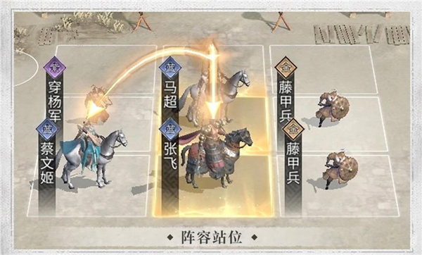 注意让马超踩到张飞和蔡文姬的追击格,形成以马超为主C的阵型,同时让盾兵顶在前排,兵等输出兵种放在后排。