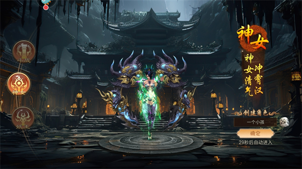 -神女:法术输出,群刷怪物效率极高,小资玩家和打金玩家首选。但打BOSS时比较吃力,毕竟血防低,需要手动走位躲避伤害,利用墙角、障碍物卡位。排山倒海技能伤害高,一次释放多次触发伤害;神龙守护专属技能,能提供高额减伤护盾。操作好的玩家玩神女,刷怪打材料非常轻松。