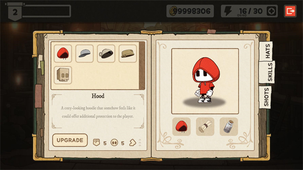 3、在主界面点击inventory可以装备不同的帽子来使用独特的能力,也可以对你的装备进行升级。