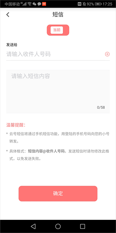 点击短信,输入号码及内容并发送