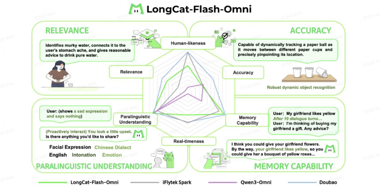 2.全模态能力突破:最新版本LongCat-Flash-Omni支持128K上下文窗口及超8分钟音视频交互,采用“分块式音视频特征交织机制”,图像理解性能对标闭源模型Gemini-2.5-Pro,短视频理解超越同类开源模型,长视频处理能力达到行业领先水平。