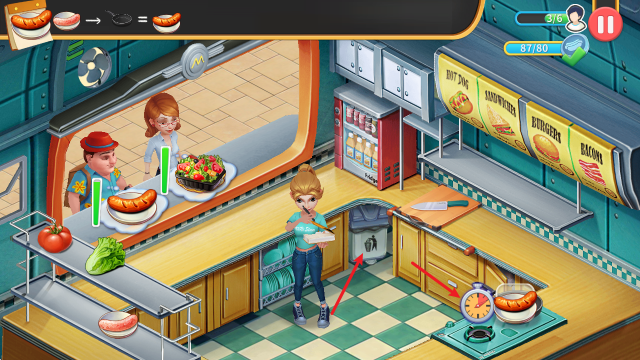 1、开始游戏后,根据客人需求来制作食物,点击对应食材到烹饪工具上即可。
